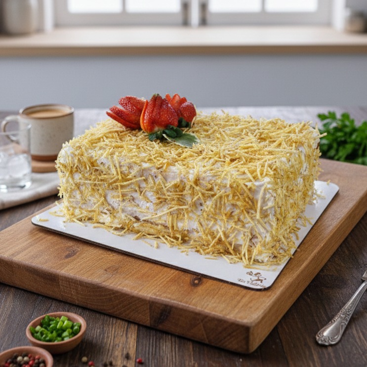 Descubra a Torta de Pão de Presunto, uma deliciosa combinação de pão de forma cortado na transversal, recheado com 5 camadas irresistíveis de patê de presunto. Coberta com uma generosa camada de catupiri cremoso e finalizada com crocante batata palha, essa torta é perfeita para quem busca um lanche saboroso e prático.
